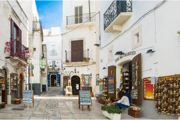 Forming the heart of Peschici is the majestic Norman Castle and Torre del Ponte(Bridge Tower). This tower is the gateway to a magical stone maze ofalley ways and stairways carved into thehill side, an area of pebble paved streets and houses that slope down to the sea with their distinctive white façades. This charming fishing town has a rich history. Just out side the town,near Manacore, you'll find a prehistoric cave (now an archaeological park),the Abbazia di Santa Maria di Càlena (one of Italy's most ancientabbeys) and the Madonna di Loreto's Sanctuary, which, according to legend, was built by a group of fishermen who had survived shipwreck.